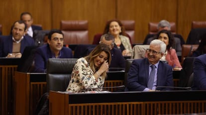 La secretaria general de los socialistas andaluces, Susana Díaz, ha centrado su primer discurso como líder de la oposición en el Parlamento andaluz en recalcar la dependencia del futuro Gobierno del PP y Ciudadanos de las políticas de extrema derecha de Vox. “Usted llega a la Presidencia con los herederos del franquismo”, le ha reprochado Díaz al nuevo presidente de la Junta, Juan Manuel Moreno. “Han tenido que apropiarse de los votos de extrema derecha para tener un Gobierno legítimo”, ha dicho. La dirigente del PSOE andaluz ha insistido en recordar que fue su partido quien ganó las elecciones y ha denunciado, como ha venido haciendo desde que empezaron las negociaciones para apear a su partido del poder en la Junta, que los acuerdos hayan sido tutelados desde Madrid. “Ha demostrado poca consideración con nuestra tierra”, le ha subrayado Díaz.
