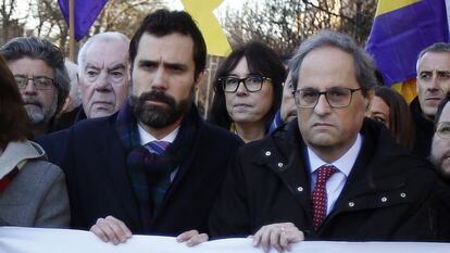 La vista empezará abordando las cuestiones previas planteadas por las defensas. Una fase que el tribunal aspira a solventar en una o dos sesiones, para dar paso a la siguiente: los interrogatorios a los acusados. Será la primera vez que comparezcan ante los siete magistrados que les van a juzgar, presididos por Manuel Marchena. Quedan por ver detalles menores pero con una formidable carga política: dónde se sentarán los acusados y si testifican en catalán. Pero el alcance de la vista, en su primer día, va más allá de lo judicial: la presencia del president Quim Torra, las protestas en los alrededores del tribunal y el debate de los Presupuestos en el Congreso. La legislatura está en juego a kilómetro y medio del Supremo.