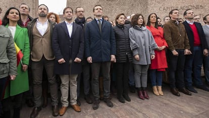 El más cómodo en esa foto fue Pablo Casado, que culebreó sobre la tribuna hasta lograr ubicarse en el centro, dejando a cada lado a Santiago Abascal y Albert Rivera. “El PP es la única fuerza capaz de pactar a izquierda y derecha”, repite el líder popular desde el acuerdo en Andalucía que, con uno de sus peores resultados —casi la mitad de escaños de los que obtuvo Javier Arenas en 2012— le permitió arrebatar al PSOE la comunidad más poblada, el mayor caladero de votos del país. Es ese pacto con Ciudadanos y Vox el que quiere exportar ahora a La Moncloa y a otros gobiernos autonómicos y municipales, revirtiendo los acuerdos entre la izquierda que en los anteriores comicios le arrebataron plazas tan importantes como “la capital del reino”, Madrid.