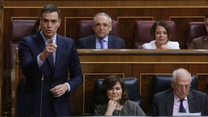 La posición crítica de Unidos Podemos con el Gobierno empieza a perfilarse. Su portavoz, Irene Montero, ha pedido “el voto útil” para su formación. “Si no se vota a Unidos Podemos ustedes pactarán con la derecha”, ha pronosticado Montero. En la réplica el presidente no se ha dado por enterado de las críticas de Montero y se ha limitado a agradecer el trabajo conjunto, constatar que ha empezado la campaña electoral y reprochar que el día anterior, ese grupo rompiera las negociaciones sobre las pensiones en la comisión del Pacto de Toledo. El colofón de críticas y advertencias lo ha puesto el portavoz de ERC, Joan Tardá, recordando a la vicepresidenta del Gobierno, Carmen Calvo, que “Cataluña iba a ser la tumba del Gobierno”. De nuevo, ha pedido negociación y diálogo. El Gobierno está dispuesto “siempre que se transite por la ley”. Tardá se ha dirigido al líder de Ciudadanos tras las múltiples manifestaciones de este hacia ellos —los ha tachado de “golpistas", "supremacistas", etcétera— en sus preguntas a Pedro Sánchez. “En defensa propia, señor Rivera, es usted un fascista”, ha respondido Tardá.