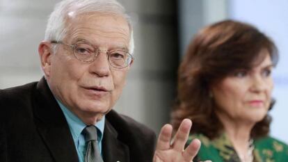 La vicepresidenta del Gobierno, Carmen Calvo, y el ministro de Asuntos Exteriores, Josep Borrell, durante la rueda de prensa tras la reunión del último Consejo de Ministros. Ángel Díaz (EFE)