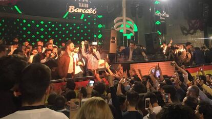 Los asistentes no trajeron muchas banderas de España porque ya estaban puestas. Siete. Arriba, abajo, en el centro y… a juego con las luces de la discoteca. Mientras los cientos de jóvenes subían fotos, comentaban en WhatsApp, subían historias a Instagram o despachaban con el de al lado, el DJ se vino arriba.