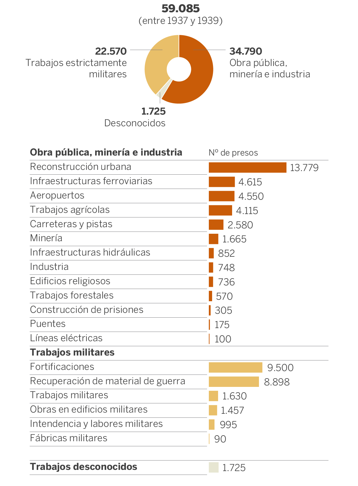 Solo entre 1940 y 1957, el total de jornadas trabajadas por presos en ferrocarriles asciende a 4,7 millones. Son datos del informe que el Gobierno ha encargado al investigador de la Universidad Complutense Gutmaro Gómez Bravo para tratar de reunir toda la información sobre el trabajo en los campos de concentración y en las prisiones, ahora dispersa.