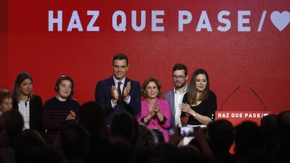 Las caras mustias de miembros del Gobierno y del PSOE que han acudido al acto transmitían por sí mismas la variedad de opiniones que ha generado el nuevo lema que complementa los mensajes en clave positiva del anterior. Como entonces, el partido ha desplegado de madrugada una lona en su sede de Ferraz con la nueva idea con la que aspira a imponer su mensaje, pero sin renunciar a la de la precampaña, que permanece colgada a unos metros. El cartel no terminaba de convencer a quienes discrepaban del primerísimo primer plano de Sánchez en la cartelería como fondo del eslogan con el que el PSOE aspira a ganar las elecciones por primera vez desde 2008 y lograr el respaldo necesario para poder mantener el Gobierno.