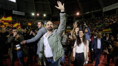 Flanqueado por los primeros espadas del partido (José Antonio Ortega Lara, Rocío Monasterio, Iván Espinosa de los Monteros) da la vuelta al ruedo de la plaza de toros la Cubierta de Leganés (Madrid). Le aclaman unas 8.500 personas, que casi llenan los tendidos. Otras 5.000 lo siguen en directo por el canal de YouTube. Unos pocos banderines verdes de Vox se pierden en un mar rojigualda. La Patria por todas partes: en los discursos, en el lema de campaña (Por España), en el himno nacional con el que se cierra el acto y hasta en la cascada de serpentina y confeti al más puro estilo americano.