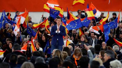 El líder de Ciudadanos propone varios pactos de Estado —por la Educación o para hacer frente a la despoblación— y medidas de regeneración democrática, como eliminar los aforamientos. También una tarjeta sanitaria única y que el español sea lengua vehicular en Cataluña. Pero el énfasis lo pone, sin duda, en el combate contra el independentismo catalán, el leit motiv del partido. "Si soy presidente no va a haber lazos amarillos, ni banderas separatistas, ni adoctrinamiento en las escuelas, ni se va a prohibir el español ni se va a insultar a los constitucionalistas. Os prometo que si soy presidente no va a haber un solo pueblo de Cataluña o de España donde no siga vigente la Constitución española", se ha comprometido entre aplausos.