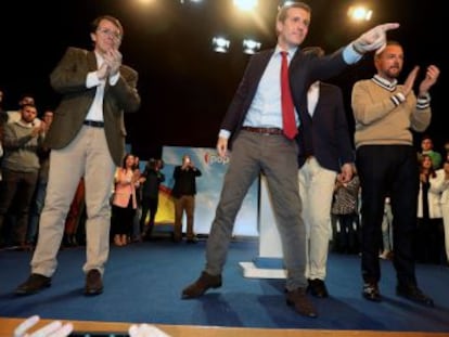 El tono y las constantes alusiones a ETA —que se disolvió en mayo de 2018 y dejó las armas en 2011— recordaba al de su competencia, Santiago Abascal. También entre las medidas del programa del PP se aprecia el afán de Casado por taponar las fugas de su electorado al partido de extrema derecha. Así, mientras Vox plantea suprimir las comunidades autónomas, un espíritu recentralizador salpica las 102 páginas del programa popular, donde se propone “reforzar la presencia del Estado en todas las comunidades autónomas”, ampliar los recursos de las Delegaciones del Gobierno, paralizar la cesión de nuevas competencias, abrir cauces para que las comunidades puedan devolver competencias al Gobierno y reformar la ley de fuerzas y cuerpos de seguridad del Estado “para garantizar la intervención en todo el territorio nacional de la Policía y la Guardia Civil”.