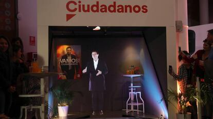 Albert Rivera se apareció en holograma en la sede de Ciudadanos Madrid desde Pedraza (Segovia), un municipio de apenas 400 habitantes escogido para simbolizar la apuesta del partido por la llamada España vaciada. El candidato estaba físicamente en Pedraza y desde allí se captó su imagen en directo para aparecer en holograma en la sede del partido en Madrid, dentro de un cubículo hecho para ese fin. Se trataba de representar, explicaron fuentes de la formación, que "Ciudadanos tiene un proyecto tanto para la España rural como para la urbana". "Hay que escuchar a la España vaciada", dijo el holograma de Rivera, que pidió "un voto naranja para decirle no a Sánchez, no a los separatistas y sí al futuro". Rivera puso el ejemplo de Cataluña, donde su partido ganó las elecciones en 2017, y Andalucía, donde el partido gobierna junto al PP y con apoyo externo de Vox, para afirmar que "es posible ganar en España". En el exterior de la sede de Ciudadanos en Madrid un grupo de unos 20 activistas de la PAH realizaron una pegada alternativa de carteles en los que se leía "Vivienda pública y social. Todo por hacer", informa Elsa García de Blas.