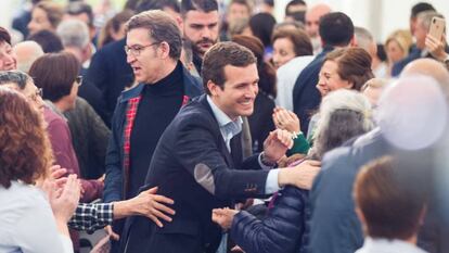 Casado ha visitado ocho veces la comunidad desde que alcanzó la presidencia del PP el pasado julio. El partido tiene ahora 12 escaños en el Congreso por Galicia. El último macrosondeo del CIS les da entre 8 y 9. A Ciudadanos 2 y a Vox, 1. Consuelo, de 89 años, una de las asistentes —abundaban los veteranos— no figura entre el amplio colectivo de indecisas. “Votaré al PP, es lo de siempre”. A ella le llevaron la entrada a su casa. Los militantes pagaron 15 euros por acudir a un mitin amenizado con churrasco, empanada y gaiteros, que es como al PP le gusta hablar de política en Galicia. En cada plato había un folleto de Casado, y dentro, un sobre con la papeleta del PP ya preparada.