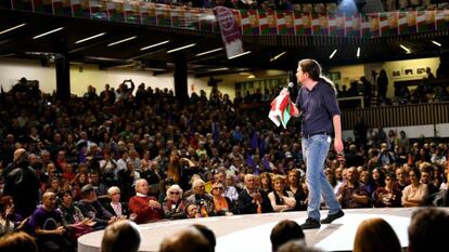 Unidas Podemos aspira a gobernar en coalición con el PSOE, pero no va a dejar de lanzar una advertencia: la posibilidad de que Pedro Sánchez y Albert Rivera vuelvan a intentar el pacto fallido de 2016 para gobernar. “¿Un Gobierno del PSOE y Ciudadanos protegería el autogobierno, la plurinacionalidad, la existencia de diferentes lenguas?”, le ha preguntado al público en ese ejercicio socrático que ya es un clásico en sus mítines. “No”, han gritado los asistentes. “Los votantes socialistas saben que la única posibilidad de que haya una garantía de un Gobierno progresista es que Unidas Podemos esté en ese Gobierno”, ha resuelto.