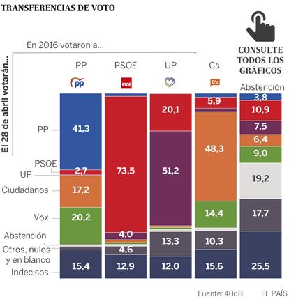 El PSOE, cuya intención de voto directa se acerca a triplicar a la del PP, eleva la fidelidad de sus electores: el 73,5% de quienes le apoyaron en 2016 asegura que repetirá el domingo (nueve puntos más que en el pasado sondeo). Y mantiene su movilización de los abstencionistas más que cualquier otra formación.