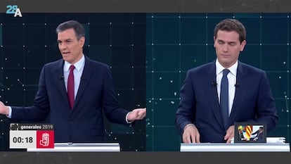 El choque se ha producido durante el bloque de política territorial del debate de este lunes en TVE, el más áspero hasta el momento y en el que Sánchez se ha enzarzado especialmente con el candidato de Ciudadanos, Albert Rivera. Éste ha colocado en su atril un marco con una fotografía de Sánchez con el president de la Generalitat, Quim Torra, durante la reunión que ambos mantuvieron en Pedralbes (Barcelona) el pasado diciembre. Sin embargo, el mayor ataque del presidente del Gobierno no ha sido contra el líder del partido naranja, sino contra el candidato del PP.