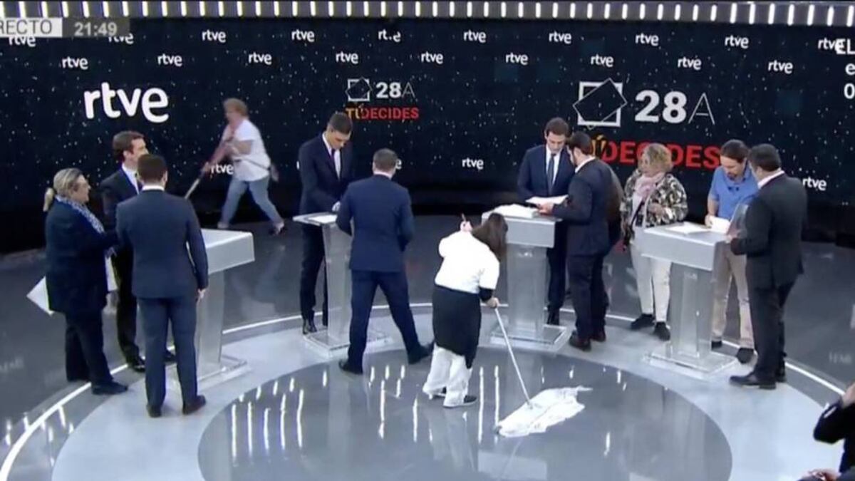 Las primeras mujeres que han irrumpido en el debate de RTVE —sobre todo en redes sociales— han sido dos limpiadoras. Uniformadas y mopa en mano, pulían el suelo del plató minutos antes del arranque del debate de cuatro candidatos varones. No se han escuchado voces de mujeres porque no hay candidatas a presidenta del Gobierno, pero sí se han citado ideas y propuestas para las mujeres que hubiera sido impensable escuchar antes de la eclosión feminista de 2018: víctimas de violencia de género, consentimiento sexual, tasa rosa, ...