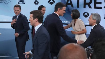 "Esta lacra afecta a todos, señor Sánchez. No sea usted mezquino, no utilice a las mujeres. Esta es una causa de todos. Este país no se merece este presidente", remató Rivera, mientras Sánchez se defendía hablando con desprecio del riesgo cierto de que "estos dos gobiernen con la extrema derecha, que habla de las mujeres de la izquierda piojosas y de la dictadura feminista". El tono llegó tan bajo que Iglesias, que seguía en el modo zen que ha adoptado en la campaña, remató el bloque con una llamada desesperada: "Estoy sintiendo mucha vergüenza en cómo transcurre este debate".