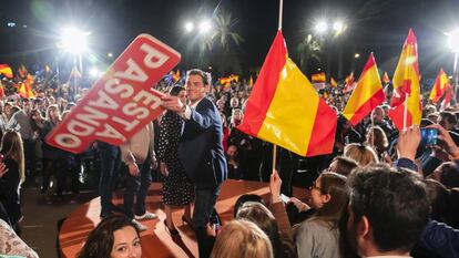 Ante unos 2.000 simpatizantes en los jardines del Palau de la Música de Valencia, Rivera centró su discurso de fin de campaña en su compromiso de que, si de él depende, desalojará al PSOE de La Moncloa. "Os prometo que si hay un solo escaño más para echar a Sánchez, lo haré. No vamos a dejar pasar la oportunidad. Vamos a darle la vuelta a la tortilla. Lo que hace falta es tener un par de razones", subrayó Rivera. Una oposición tajante a entenderse con el PSOE y la defensa de un país sin diferencias entre comunidades autónomas fueron los ejes de su mensaje. "Quiero una España sin privilegios", incidió. La puerta cerrada a pactar con el PSOE contrasta con la puerta entreabierta a Vox. “Sánchez a tu casa y Cs a La Moncloa”, incidió Rivera este viernes. Toda la contundencia contra Sánchez se diluye ante la pregunta de si Vox podría entrar en el Gobierno conjunto que ofrece al PP. Se lo preguntaron por la mañana los periodistas antes de su carrera en camiseta naranja. Antes de salir al trote, prefirió no cortar ese camino. “Me parece una falta de respeto en este momento, en vez de hablar de ganar, repartir ministerios”, zanjó.
