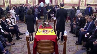 “No me muevo de aquí hasta que no me vea la ministra de Defensa o el presidente del Gobierno”. Un hombre ha lanzado esta mañana un puñado de papeles ante el féretro de Alfredo Pérez Rubalcaba en la capilla ardiente instalada en el Congreso de los Diputados. “Quiero hablar con el CNI”, ha añadido. "Soy el presidente del Gobierno, acompáñeme", le ha contestado Pedro Sánchez, que se ha levantado para hablar con él y, ante el desconcierto y la mirada de los familiares del exvicepresidente del Gobierno, se lo ha llevado a otra sala, acompañado por Ana Pastor, presidenta del Congreso.