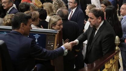 Una de las imágenes insólitas este martes durante la jornada de constitución de las Cortes de esta XIII Legislatura ha sido el breve encuentro y apretón de manos que han tenido en el hemiciclo el presidente del Gobierno en funciones, el socialista Pedro Sánchez, y el diputado y líder de ERC, Oriol Junqueras, en prisión preventiva en la cárcel madrileña de Soto del Real por estar procesado por su implicación en el proceso independentista en Cataluña, que está juzgando desde hace meses el Tribunal Supremo.