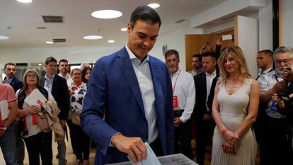 Sánchez ha sido el primer líder nacional en acudir a las urnas. El presidente del Gobierno en funciones y secretario general del PSOE ha llegado a su colegio electoral de Pozuelo de Alarcón (Madrid) poco después de las 9.30. Tras depositar sus votos, ha pedido "movilización" porque, ha dicho, los españoles se juegan "seguir avanzando en limpieza y regeneración democrática". El triunfador de los comicios generales del pasado 28 de abril, que ya está negociando acuerdos con otras fuerzas para la investidura, ha destacado que "hoy termina un ciclo electoral muy intenso". "A partir de mañana, debemos dejar atrás la dialéctica electoral" y contribuir a que haya "un horizonte de estabilidad", ha reflexionado Sánchez.