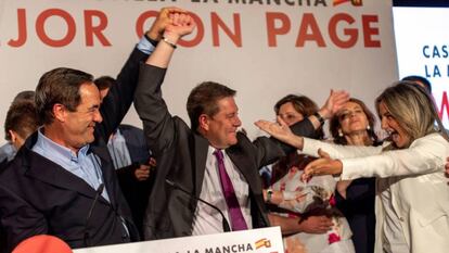 El cigarral de El Ángel Custodio (Toledo), donde se reunieron los socialistas, era una fiesta antes de que llegara la medianoche y de que finalizase el escrutinio. Fue una velada sin demasiadas sorpresas para los del PSOE, que se sabían favoritos desde la última encuesta del Centro de Investigaciones Sociológicas (CIS), que ya les llevaba a rozar la mayoría absoluta —17 escaños de los 33 de las Cortes manchegas—. Los sondeos a pie de urna confirmaban también sus buenas expectativas al cierre de los colegios electorales. Y los resultados del escrutinio terminaron por ratificar los mejores augurios: 19 escaños, mayoría absoluta. La victoria del socialista Emiliano García-Page es la segunda mejor de toda la historia de los socialistas manchegos, después de la obtenida por Bono contra Suárez Illana en 2003. Si se va, como dijo, después de esta legislatura, lo hará por la puerta grande.