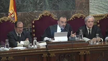 El juicio del procés ha llegado este martes a una fase sobre la que se habían levantado muchas expectativas: la exhibición de las decenas de vídeos propuestos por las acusaciones y las defensas como pruebas de sus tesis. Las grabaciones que han empezado a reproducirse ponen imágenes y sonido a los relatos que los testigos han expuesto en semanas anteriores, aunque la sesión ha discurrido con algo de confusión porque la Fiscalía no ha podido concretar a qué hechos responden algunas de las imágenes. Esta situación ha provocado las quejas de las defensas y el tribunal les ha emplazado a impugnar las grabaciones que consideren que no deben admitirse como prueba.