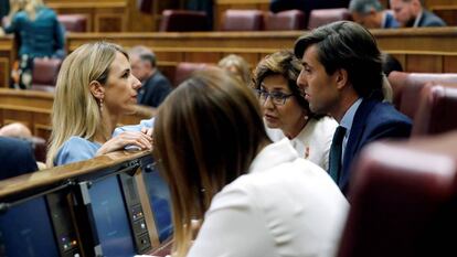 El Congreso amplió el plazo hasta este miércoles a las 20.00 para formar grupos y nombrar portavoces. El PP aún no lo tiene. Por ahora mantendrá interino durante las próximas semanas a José Antonio Bermúdez de Castro, secretario general las tres últimas legislaturas. La dirección del PP reconoce que busca en sus filas el perfil de una mujer para ese cargo porque, entre otras razones, no quiere presentar la imagen de que en los puestos principales de su bancada hay solo hombres, tras las primeras posiciones, ya seguras, del líder, Pablo Casado, y el número dos, Teodoro García Egea. Los otros tres principales partidos tienen mujeres de portavoces: Adriana Lastra (PSOE), Inés Arrimadas (Ciudadanos) e Irene Montero (Podemos).