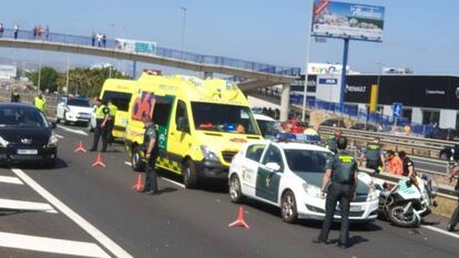 El policía perseguía con su moto a un vehículo cargado de hachís al que le había dado dado el alto. Los agentes han detenido esta tarde a dos de los sospechosos
