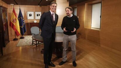 Pedro Sánchez y Pablo Iglesias se habían citado a las 10.00 en el Parlamento. Los dos líderes políticos se han vuelto a ver las caras después de más de 15 días sin hablar. Su última cita fue hace más de un mes. Entonces parecía factible que Unidas Podemos entrara en el Gobierno siempre que no estuviera al frente de ministerios de los llamados de Estado. Iglesias está preparado para un pulso largo con un objetivo: lograr dirigir carteras sociales. Su modelo es el pacto de la Comunidad Valenciana.