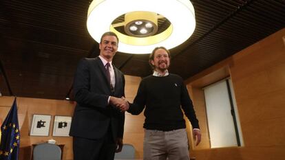 Durante semanas, Sánchez e Iglesias jugaron a fingir que no veían el elefante que tenían en la habitación. Hubo dos reuniones importantes, con cámaras, en las que no se concretó nada. Los dos sabían que el problema llegaría al hablar de los ministerios, así que se dedicaron a pactar palabras amables: primero, el “nos hemos puesto de acuerdo en ponernos de acuerdo” que lanzó Iglesias tras la primera cita, nada más celebrarse las generales y antes de las municipales. Después, tras un silencio tenso de tres semanas, el “nos hemos puesto de acuerdo en un Gobierno de cooperación”. Se trataba solo de ganar tiempo hasta llegar al momento definitivo, que estalló el lunes.