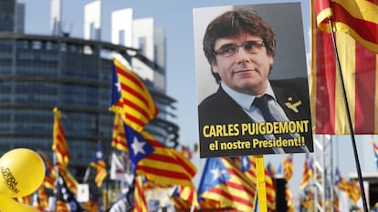 La cautela apaciguó la tentación del golpe de efecto. Carles Puigdemont ha eludido participar, por consejo de sus abogados, en la protesta convocada este martes por el independentismo en Estrasburgo ante el Parlamento Europeo para criticar la exclusión del escaño de tres de sus representantes. Los secesionistas se han lanzado a su segunda gran movilización europea un año y medio después de la manifestación de Bruselas. La concentración fue convocada por el denominado Consell de la República frente a la sede de la Eurocámara, donde han pedido que se admita a Oriol Junqueras, Carles Puigdemont y Antoni Comín como europarlamentarios. Según la policía, han participado unas 10.000 personas —en Bruselas fueron 45.000, aunque coincidió con un festivo— llegadas en un centenar de autobuses, dos vuelos chárter y vehículos particulares. La gran incógnita hasta última hora fue si Puigdemont aparecería en el acto, pero su abogado Gonzalo Boye se encargó de atajar las especulaciones: pese a que su cliente se había desplazado hasta las proximidades del evento, le recomendó que no acudiera a la protesta ante el temor de que fuera detenido si cruzaba la frontera entre Alemania y Francia.