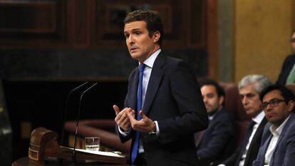 Pablo Casado explicó el voto en contra del PP a la investidura de Pedro Sánchez asegurando que el líder socialista “no es de fiar” porque “la cabra tira al monte” y volverá a pactar con independentistas. Acusó al PSOE de haber “salido del espacio constitucional” y explotó la contradicción de que quien dimitió por no abstenerse en la investidura de Rajoy exija ahora al PP que lo haga. Su tono, sin embargo, era deliberadamente más suave. Casado quiere subrayar su liderazgo de la oposición marcando distancias con el estilo agresivo de Rivera.