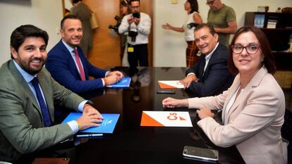 Es la segunda vez que López Miras se somete a la investidura, ya que el pasado 4 de julio no consiguió el voto favorable de los cuatro diputados de Vox y sus 16 escaños, sumados a los 6 de Ciudadanos, se quedaron a uno de la mayoría absoluta. Tras 20 días de negociaciones, el popular afronta esta sesión con un acuerdo cerrado para formar un Gobierno de coalición en el que Ciudadanos tendrá la vicepresidencia y los de Santiago Abascal pasarán a la oposición con un decálogo de compromisos que el nuevo Ejecutivo, ha insistido López Miras, son “perfectamente compatibles” con su programa.