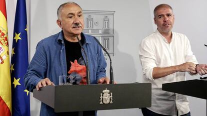 Los sindicatos creen que a la hora de formar un nuevo Gobierno todo pasa por un "acuerdo programático" entre el PSOE y Unidas Podemos. Por eso le piden a la formación morada que se centre en eso. La demanda a ambas formaciones de UGT y CC OO es prácticamente la misma, si acaso cambia algo el tono. "Que empiecen por negociar el programa", reclama Pepe Álvarez, de UGT, en conversación telefónica con EL PAÍS. "El mensaje se lo damos a los dos. Que se avance en ese pacto programático que desbloquee la situación", remacha Unai Sordo, de CC OO, un día después de verse con el presidente en funciones, Pedro Sánchez, en La Moncloa.