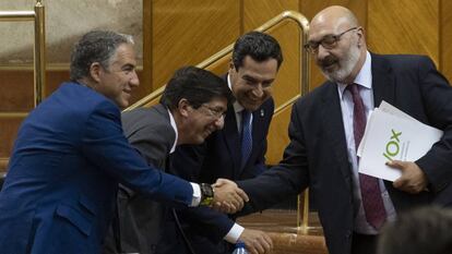 El consejero Elías Bendodo, el vicepresidente de la Junta, Juan Marín, y el presidente Juan Manuel Moreno saludan al portavoz de Vox. En vídeo, Vox aboga por suprimir actividades del Instituto Andaluz de Mujer.Vídeo: PACO PUENTES | ATLAS