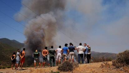 El incendio forestal permanece sin control y su reflejo se puede ver desde el propio casco urbano esteponero. Las llamas, que se originaron este lunes sobre las 11.00, siguen avanzando por el término municipal de Estepona. El viento de terral, las altas temperaturas —se han rozado los 40 grados de máxima durante el día— y la presencia de barrancos y vaguadas está complicando al máximo la contención del avance del fuego, que ha quemado ya 85 hectáreas "de gran valor ecológico", según la Junta de Andalucía. Por ahora no ha alcanzado el paraje natural Los Reales de Sierra Bermeja, zona conocida por la presencia de un bosque de pinsapos.