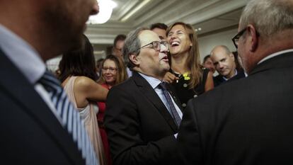 El desbordamiento emocional que ha dejado el procés conduce al abuso de expresiones como golpe de Estado desde Madrid o a tildar de franquismo embozado a la democracia española desde Barcelona. Lejos de rebajar el tono, Torra —muy aislado en Madrid: solo le arroparon dirigentes de su partido; apenas había representantes de ERC o de otros grupos nacionalistas— comparó hasta tres veces a Cataluña con Hong Kong y a España con China en un desayuno informativo organizado por Europa Press en Madrid. “No hay un problema de convivencia en Cataluña”, explicó en referencia al análisis de Sánchez sobre los efectos del desafío catalán. “Hay un problema democrático, de imposición del silencio”, con “políticos y activistas en una impresentable prisión preventiva desde hace casi dos años”. Torra, que llegó a citar a Martin Luther King —aunque en esta ocasión dejó de lado a Mandela o Gandhi, habituales en sus discursos—, echó mano del argumentario habitual independentista. Cargó contra la sentencia del Constitucional sobre el Estatut. Criticó la falta de inversiones del Estado y el supuesto déficit fiscal del 8% del PIB (que, en el peor de los casos, se sitúa en torno al 2% del PIB: hay 14.000 millones de diferencia entre la estimación de Torra y las cifras que ofrecen otros expertos). Y vaticinó que la sentencia del procés “abrirá una nueva etapa para las reivindicaciones independentistas”, aunque evitó dar detalles al respecto. ERC y el PDeCAT llevan semanas tratando de pactar una respuesta consensuada a la sentencia. De momento no hay fumata blanca.