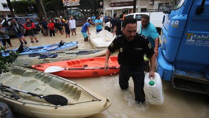 Los Alcázares (15.600 habitantes), al borde del Mar Menor, aún muestra la furia de la torrentera. Una enorme tubería escupe barro junto al puente, en cuyos ojos se ha estampado tanto un Audi familiar como un taburete de pino. “El agua pasaba por encima de la carretera”, exclama una mujer. “Yo me salvé porque vivo en un segundo, ahí”. En la calle principal hay un enorme ajetreo de coches patrulla, camiones del servicio forestal que achican el agua de los garajes, gente con botas embarradas transportando cepillos, sorteando losetas levantadas y lagunas de barro pegajoso.