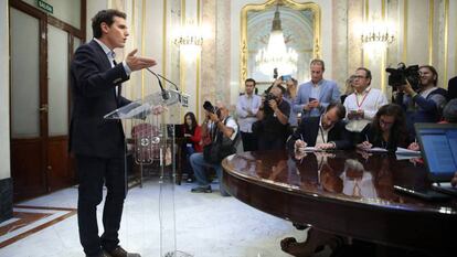 Ante la evidencia de que la repetición electoral prolongará casi otro medio año el tiempo que España no tendrá un Gobierno estable, Albert Rivera promete que si la derecha suma tras el 10 de noviembre, acelerarán los tiempos al máximo para gobernar. El líder de Ciudadanos se ha comprometido este miércoles a acordar un Ejecutivo de coalición con el PP en menos de un mes si los partidos de la derecha consiguen un solo escaño más que la izquierda. "Llamaré a Pablo Casado y formaremos Gobierno. Me comprometo a hacerlo en menos de un mes", ha anticipado Rivera en una comparecencia en el Congreso. Ciudadanos vuelve a unir su destino al PP, pero no quiere hacerlo en una coalición electoral: Rivera ha descartado integrarse en la iniciativa de España Suma que promueve Casado.