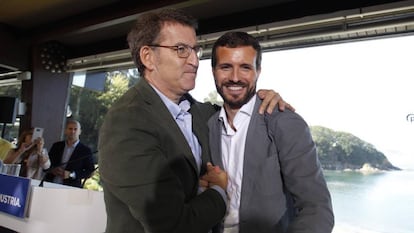 Galicia se ha convertido para Pablo Casado en una escuela de “moderación” para culminar con éxito su segundo intento de llegar a La Moncloa. Este domingo, el candidato del PP a la presidencia del Gobierno ha tenido que escuchar varios consejos antes de intervenir en el mitin celebrado en Oleiros (A Coruña). “El mejor ejemplo lo tienes aquí”, le ha instruido el presidente provincial del partido en A Coruña, Diego Calvo. “Los mejores logros se consiguen desde la prudencia, el trabajo y la moderación”. “Nuestro PP”, ha añadido seguidamente el presidente gallego, Alberto Núñez Feijóo, es ese partido de “centroderecha reformista y liberal” que fundó Manuel Fraga, se “consolidó” con José María Aznar y “consiguió 11 millones de votos” con Mariano Rajoy. Casado se ha declarado buen alumno: “Vengo a comprometerme con vosotros, con la lección aprendida”.