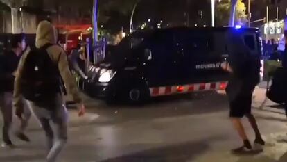 Los Mossos blindaron la Delegación del Gobierno y la decisión dividió la protesta en dos: por un lado, el acto festivo en el que Lluís Llach cantó en el escenario y, por el otro, cientos de personas se enfrentaron a la policía en la esquina entre Paseo de Gràcia y Mallorca. Los manifestantes lanzaron objetos contra la línea policial, hasta una motocicleta eléctrica de alquiler fue arrojada a una hoguera y rompieron el escaparate de una agencia inmobiliaria, informa la agencia Efe. La policía autonómica les advirtió sin éxito por megafonía y acabaron cargando mientras muchos jóvenes armaban barricadas. En medio de la batalla campal clamaron “¡Buch dimisión!”, en referencia al consejero de Interior de la Generalitat.