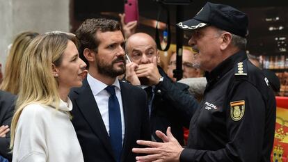 El presidente del PP, Pablo Casado, se ha desplazado este lunes a Barcelona para agradecer a las fuerzas de seguridad del Estado su labor para preservar “el orden público, la seguridad y las libertades de todos los catalanes”. Tras el perímetro que blinda la Jefatura Superior de Policía de Barcelona, escenario de graves choques entre manifestantes y policías en la última semana, Casado ha reclamado más medios y efectivos para las fuerzas de seguridad y que se permita a la Guardia Civil, cuya actuación se limita estos días a la protección de infraestructuras, participar de las “labores contra los disturbios”. “No cabe apelación al diálogo, sino a la concordia. No cabe una apelación a la negociación, sino a la ley y al orden”, ha considerado.