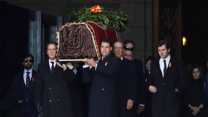 Ocho familiares transportaron a hombros el ataúd hasta la explanada donde esperaba el coche fúnebre para llevar el féretro hasta el helicóptero. La familia lo cubrió con el pendón de los Franco y adornó el féretro una corona de flores con los colores de la bandera española en los que se leía: “Tu familia”. En el helicóptero, acompañando los restos del dictador hasta el cementerio de Mingorrubio, viajaron la ministra de Justicia y Francis Franco. No intercambiaron una sola palabra en los 15 minutos de trayecto.