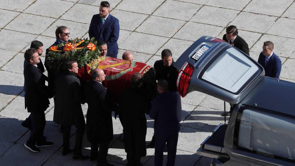 La comitiva familiar salió de la basílica del Valle de los Caídos a las 12.45. La caja con los restos de Franco era portada a hombros por ocho familiares varones mientras que el resto les seguía a paso lento, hasta depositar el féretro en un coche. En el momento en que el ataúd era introducido en el vehículo funerario, la familia del dictador lo ha despedido al grito de "¡Viva España!" y "¡Viva Franco!". Al fondo, desde la puerta de la iglesia, presenciaban la escena los representantes del Gobierno: la ministra de Justicia, Dolores Delgado, el secretario general de la Presidencia, Félix Bolaños, y el subsecretario del Ministerio de la Presidencia, Antonio Hidalgo.