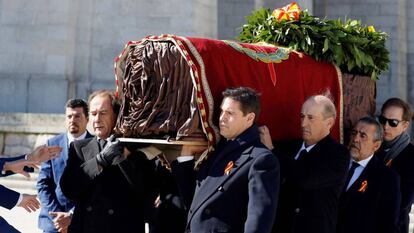 Hay féretros que los carga el diablo y muertos enterrados personalmente por él. Eso cuando no se encarga de todo la familia Franco: de cargar el féretro y enterrarlo en otro lugar, lejos del monumento construido por el dictador para su propia gloria. De la basílica de Valle de los Caídos, con una pompa y un silencio impropios, retransmitido en directo, salieron los primeros Francis Franco y Luis Alfonso de Borbón sosteniendo el ataúd, los dos como perfecta descripción del nacionalcatolicismo: páginas de Sucesos y páginas de Sociedad, como si a Franco lo sacasen entre El Caso y el Hola. No hubo escandaloso tropezón, ni debilitamientos repentinos, ni inoportuna torpeza; como si el Estado, con su mirar para otro lado respecto al origen de sus fortunas y sus generosas dádivas, hubiera fortalecido a los Franco para que, llegado el día, pudiesen sacar ligeros al dictador. De algo valió. Y no es mala profesión, en caso de querer una, la de portadores de dictadores muertos. Casi parece el nombre de una banda de rock.