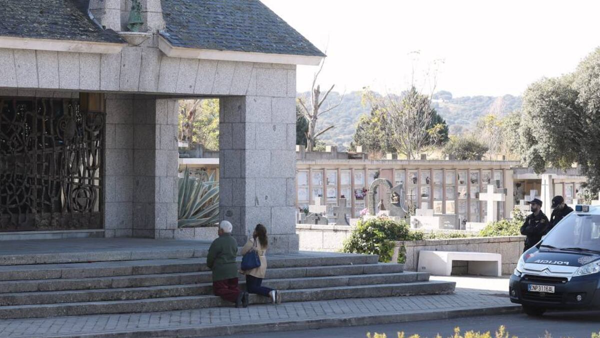 A 500 metros de las casas, a las que se llega por la carretera de Colmenar en una vía sin salida, está el cementerio. La Policía Nacional custodia el panteón en el que se enterró al dictador 24 horas antes -en una tumba distinta a la de su mujer, Carmen Polo- y que amanece sin una triste flor, una decena de periodistas espera a que pase algo y seis agentes vigilan la entrada. A lo largo de la mañana un repartidor deja tres ramos en las puertas cerradas de la capilla del panteón y un goteo de personas pasan a echar un ojo, previa identificación policial. Una de ellas es Cayetana que, acompañada de un matrimonio, deposita un nuevo ramo. El hombre dice que no quiere identificarse porque viene de “retiro espiritual” y advierte a los agentes que apuntan su DNI que ellos son “gente de orden”.