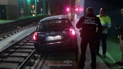 Un hombre circula con su coche por la vía del tren hasta la estación sevillana de Santa Justa