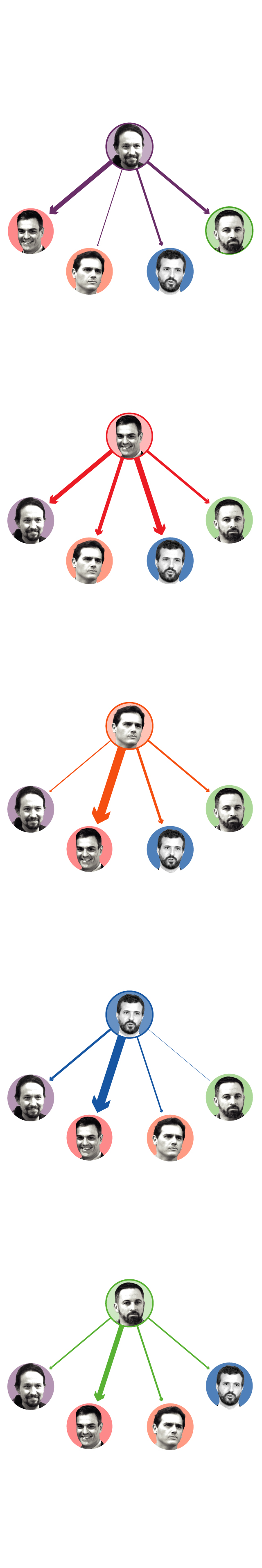 Entre los "socios preferentes" de la derecha, el líder de Ciudadanos interpeló más a Casado (siete veces) que viceversa. Vox, no obstante, repartió sus reproches a partes iguales: cuatro al presidente del PP, cinco a Rivera. Los representantes de los tres partidos se centraron en atacar a Pedro Sánchez: 24 veces le interpelaron los líderes del PP y Ciudadanos, y 14 Abascal.