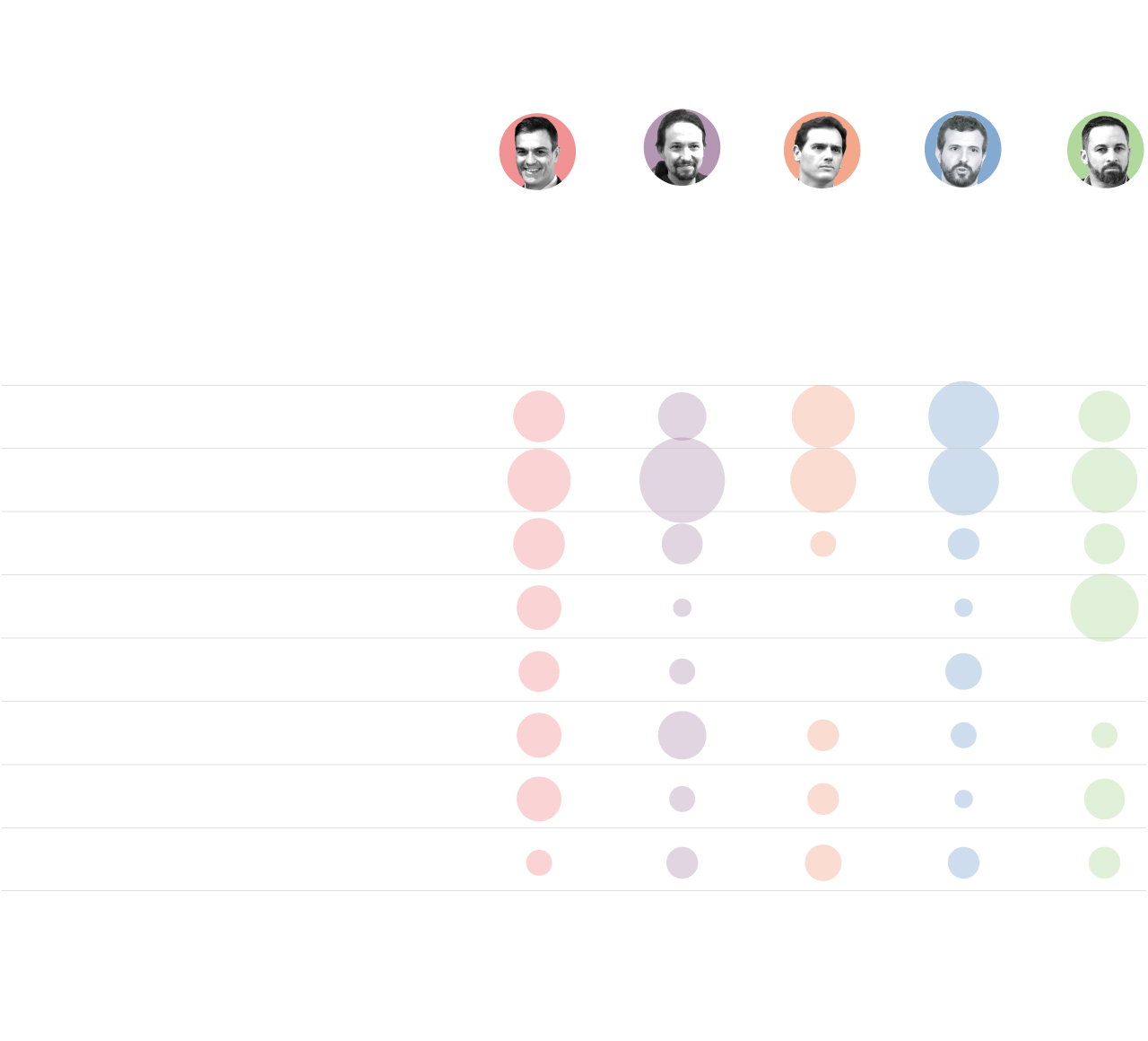El debate estaba estructurado en bloques amplios, pero los candidatos no los respetaron estrictamente y aludieron con frecuencia a otros temas. Así, por ejemplo, el líder de Vox volvió a hablar de memoria histórica y la exhumación de Franco en el momento de debatir medidas sobre violencia de género. Por temas, ganaron los asuntos relacionados con la economía y el paro, con 75 menciones repartidas de la siguiente manera: Sánchez, 12 veces; Iglesias, 22; Rivera, 13; Casado, 15 y Abascal 13. Sánchez anunció, por ejemplo, que si gana las elecciones, nombrará a Nadia Calviño vicepresidenta económica. Casado enseñó una portada con los recortes de José Luis Rodríguez Zapatero de 2010 y puso en duda que el actual líder socialista pudiera afrontar la crisis si se dedicaba a minimizarla.