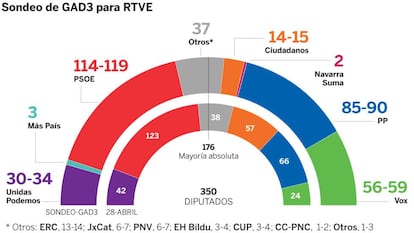 El PSOE habría ganado las elecciones generales de este 10-N aunque bajando en número de escaños respecto al 28-A, según el sondeo de GAD3 para RTVE, en el que el PP sube en número de escaños y Vox se convierte en la tercera fuerza del Congreso tras el desplome de Ciudadanos. Podemos resiste, aunque pierde algunos asientos. El sondeo, cuyo trabajo de campo se ha llevado a cabo entre el pasado 25 de octubre y este domingo, otorga entre 114 y 119 diputados al PSOE, frente a los 123 den abril; el PP logra de 85 a 90, por 66 del 28-A; Vox sube a una horquilla de entre 56 y 59 escaños, frente a los 24 que tenía; Unidas Podemos obtendría entre 30 a 34 asientos, por 42 de ahora, y Ciudadanos se precipita hasta solo 14 o 15 diputados, de los 57 que logró en abril. Por primera vez entran en el Congreso Más País, el partido de Íñigo Errejón, con 3 asientos, y los antisistema de la CUP, que tendrían 3 o 4 escaños. Además, ERC lograría 13 o 14 escaños (tenía 15); JxCat, 6 o 7 (ahora tiene 7), al igual que el PNV, que ahora tiene 6. Ninguno de los bloques logra una mayoría clara para gobernar. La participación a las 18.00 era del 56,86%, casi cuatro puntos menos que en los comicios celebrados el pasado abril (60,74%). La jornada se ha desarrollado con total normalidad. Siga aquí la última hora del 10-N. Si no puede seguir la narración en directo, pinche aquí. Si quiere ver el programa especial de TV de EL PAÍS, pulse aquí.