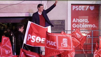 El presidente en funciones retuvo la victoria a costa de dejarse en el camino casi 800.000 votos —pasó de 7,5 a 6,7 millones— y tres diputados. La subida de sendos escaños en Huelva y Huesca no compensó la pérdida de cinco en Madrid, Baleares, Cantabria, Navarra y Ceuta. Aun así, rozando la medianoche, Sánchez celebró el triunfo en un escenario montado con urgencia en la calle Ferraz. “Me gustaría hacer una llamada a todos los partidos: tienen que actuar con generosidad y responsabilidad para desbloquear la situación política en España. Nuestro proyecto político es formar un Gobierno estable y hacer política en beneficio de los españoles”, dijo con una sonrisa y entre los gritos de unas 500 personas de “¡Hemos ganado, dejadnos gobernar!”. El líder socialista excluyó de su ofrecimiento a las formaciones “que se autoexcluyen de la convivencia y siembran el discurso del odio”, aparentemente en alusión a Vox. También hubo algunos gritos anecdóticos a favor de pactar con Pablo Iglesias, líder de Unidas Podemos.