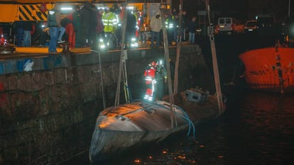 El narcosubmarino hundido el pasado domingo en la ría de Aldán, en el municipio pontevedrés de Cangas do Morrazo, ha sido reflotado en la noche de este martes por equipos de especialistas de la Guardia Civil y del Servicio de Vigilancia Aduanera e izado hasta el puerto, donde agentes de Policía Nacional han podido acceder a su interior para analizar las características del "inédito aparato". Una vez fuera del agua, se ha podido comprobar que tiene "aproximadamente 20 metros de eslora" y que en su interior había "152 fardos con más de 3.000 kilos de cocaína que podrían superar los 100 millones de euros en el mercado negro". Así lo ha declarado el delegado del Gobierno en Galicia, Javier Losada, desde el puerto de Aldán.